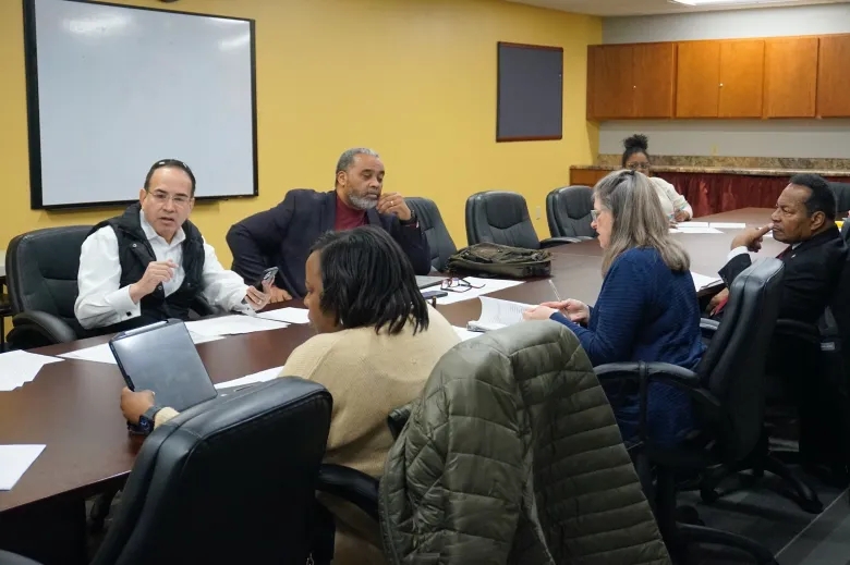 Jorge Franco (from left), Walter Lanier, Jackie Q. Carter, Pam Fendt and Spencer Coggs discuss the Social Development Commission’s board policies on March 20 at the SDC main office, 1730 W. North Ave. (Photo by Meredith Melland)