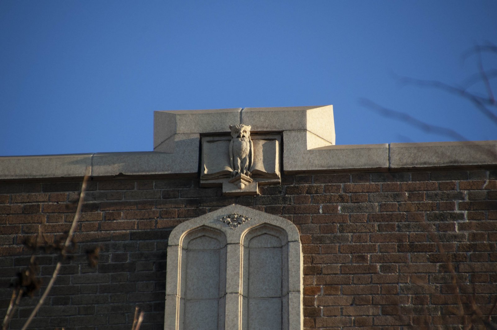 Merlons patterned with owls surround the parapet at Marquette University High, modeled by the American Terra Cotta & Ceramic Co. in 1924.