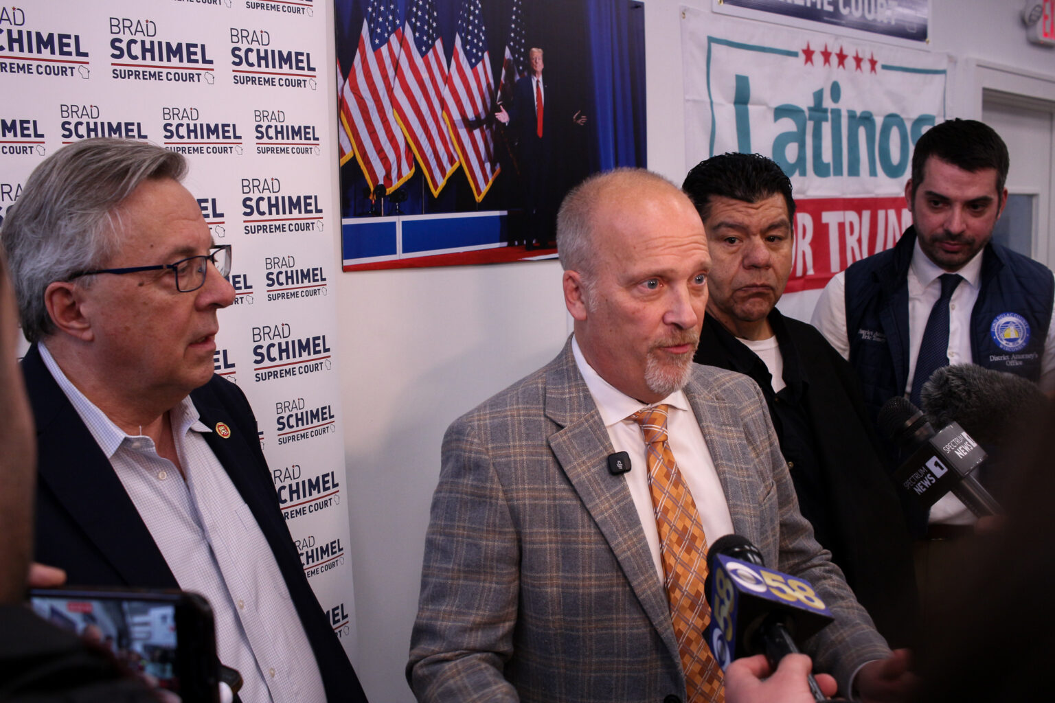 Following the April state Supreme Court loss, Republican Party of Wisconsin Chair Brian Schimming launched an effort to examine what went wrong led by state Treasurer John Leiber. Schimming, Brad Schimel, Milwaukee pastor Marty Calderon and Fond du Lac County District Attorney Eric Toney pictured answer questions from the press in February 2025. (Henry Redman | Wisconsin Examiner)