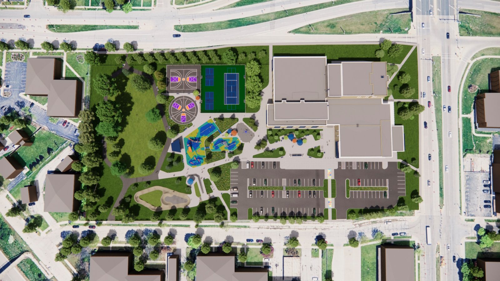 Aerial View of Neighborhood Center Plan Rendering by Quorum Architects.