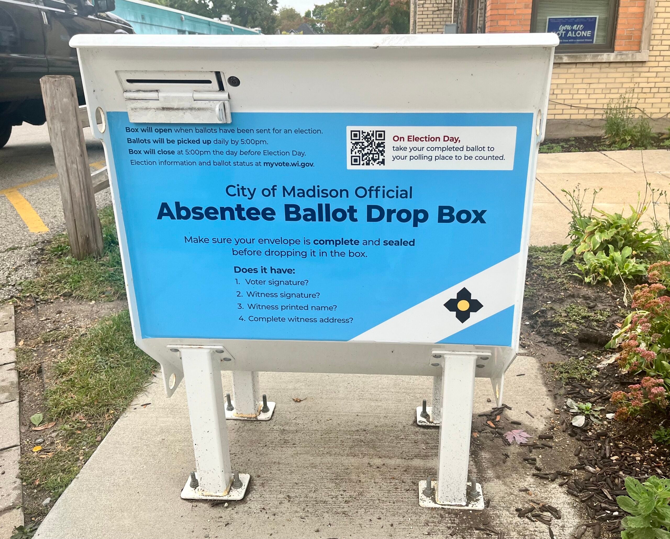 An absentee ballot drop box is seen on the east side of Madison on Sept. 22, 2024. Alyssa Allemand/WPR