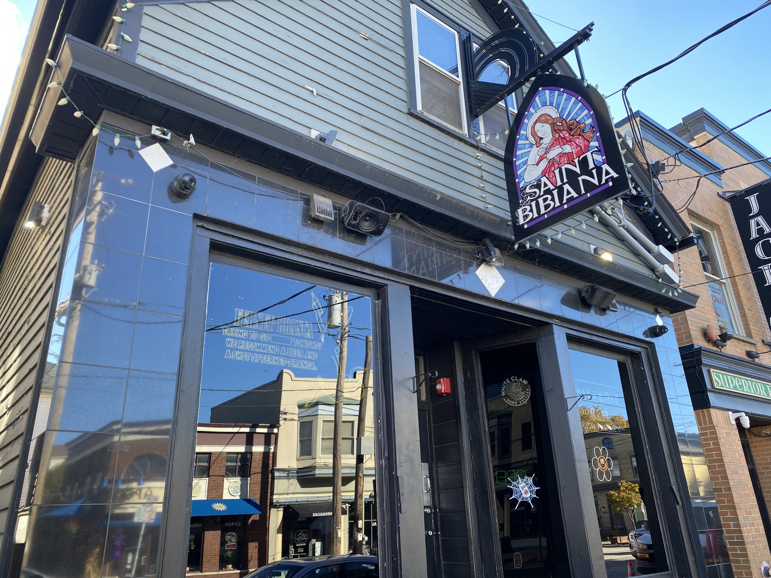 Saint Bibiana is mainly a bar that also happens to serve good food. It is located in a building on Brady Street that formerly housed Waterford Wine before its move to Farwell Avenue. Opened in 2021, it was the brainchild of Jeno and Lorenzo Cataldo, the owners of Jo-Cats Pub and Dorsia, immediately next door. For Saint Bibiana they opened the ceiling and the rest of the building and created something that according to our server was intended to resemble a church. When you look up, at one end you will see a second floor balcony, also known as the choir loft, and at the other end above the door, the altar. On weekends there is music, occasionally live, and the owners open a bar in the loft where people dance. A bar with a church-y atmosphere seems appropriate combo since Saint Bibiana is reputed to be the patron saint of hangovers.