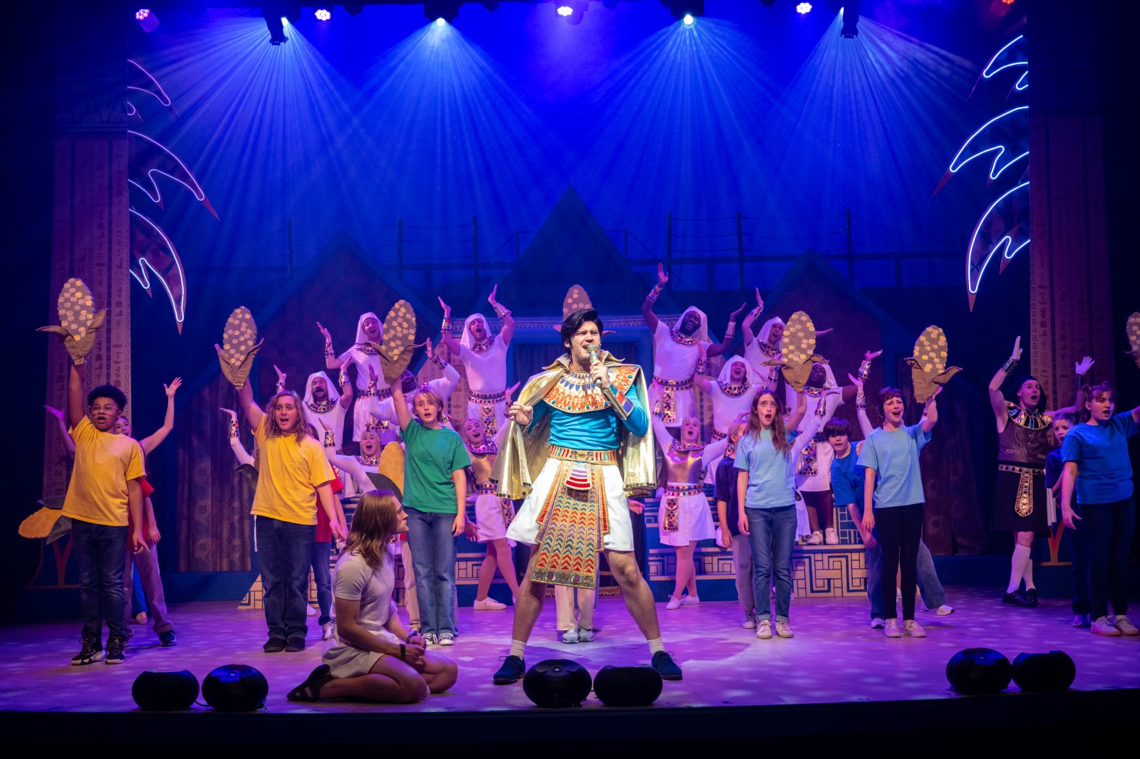 (I to r front line) Mason Hanizeski as Joseph and Alex Campea as Pharaoh, and the cast in Skylight Music Theatre’s production of Joseph and the Amazing Technicolor® Dreamcoat, running November 14 through December 28, 2025.