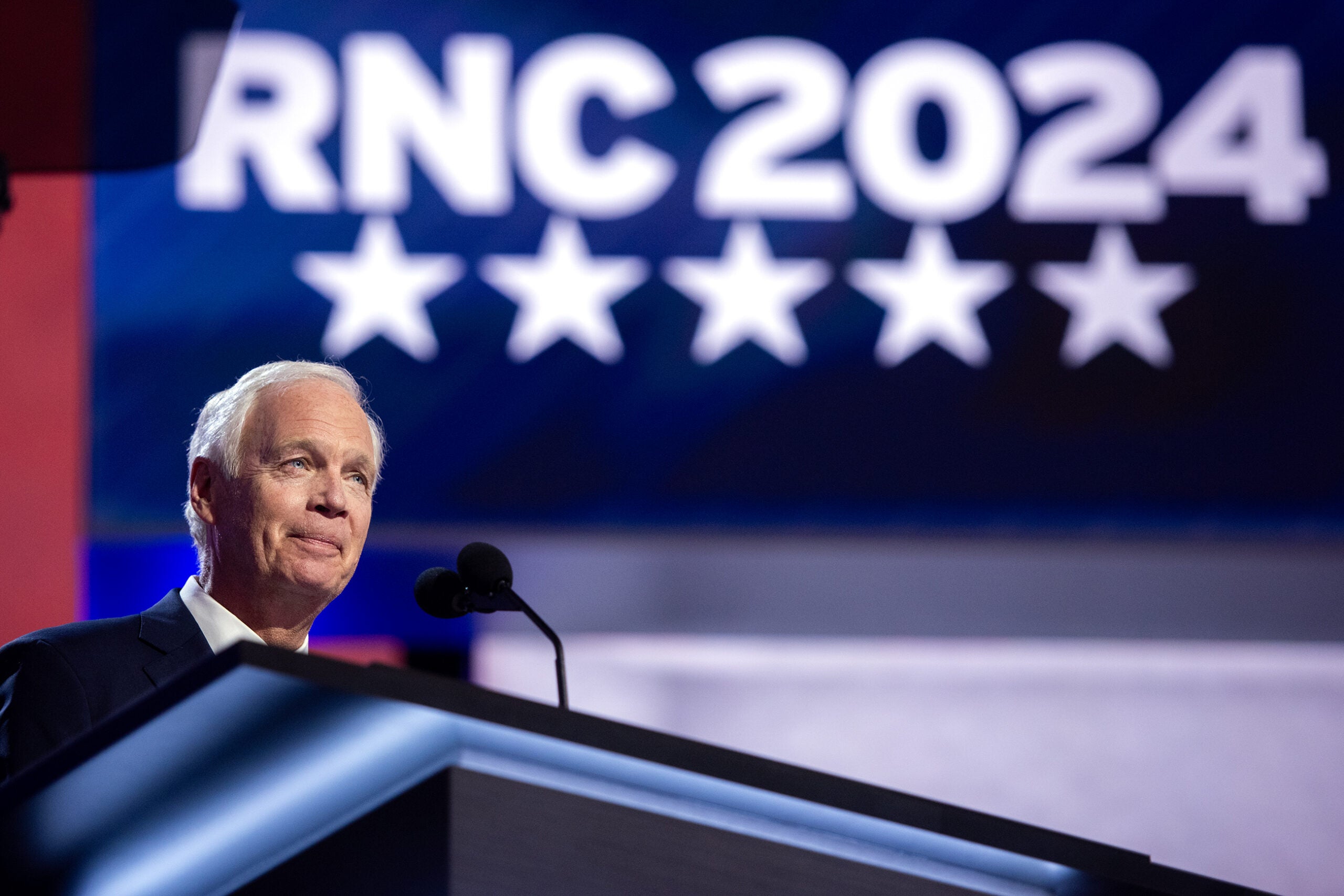 Sen. Ron Johnson speaks at the RNC on Monday, July 15, 2024, at the Fiserv Forum in Milwaukee, Wis. Angela Major/WPR