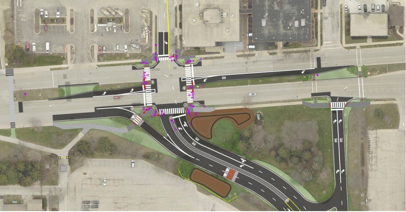 Reconfigured entrance and exit at intersection of N. 99th Street and W. Bluemound Rd.