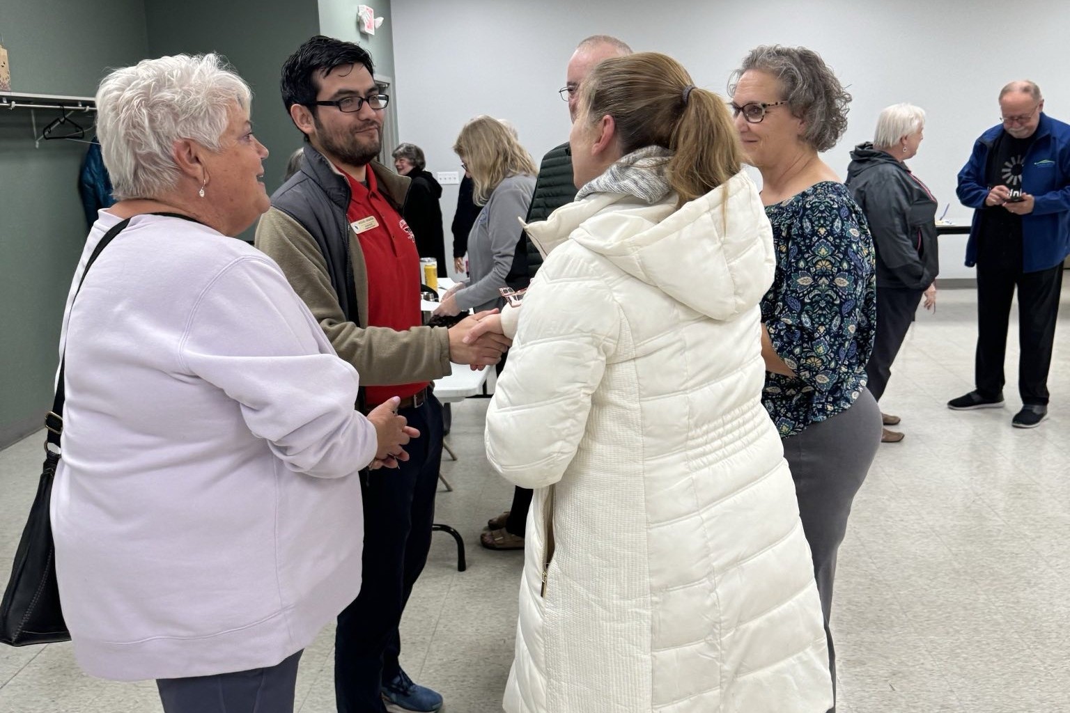 Miguel Aranda speaks with Democratic Party members after a party meeting in Kenosha on Nov. 6, 2025. (Photo courtesy of Aranda congressional campaign)