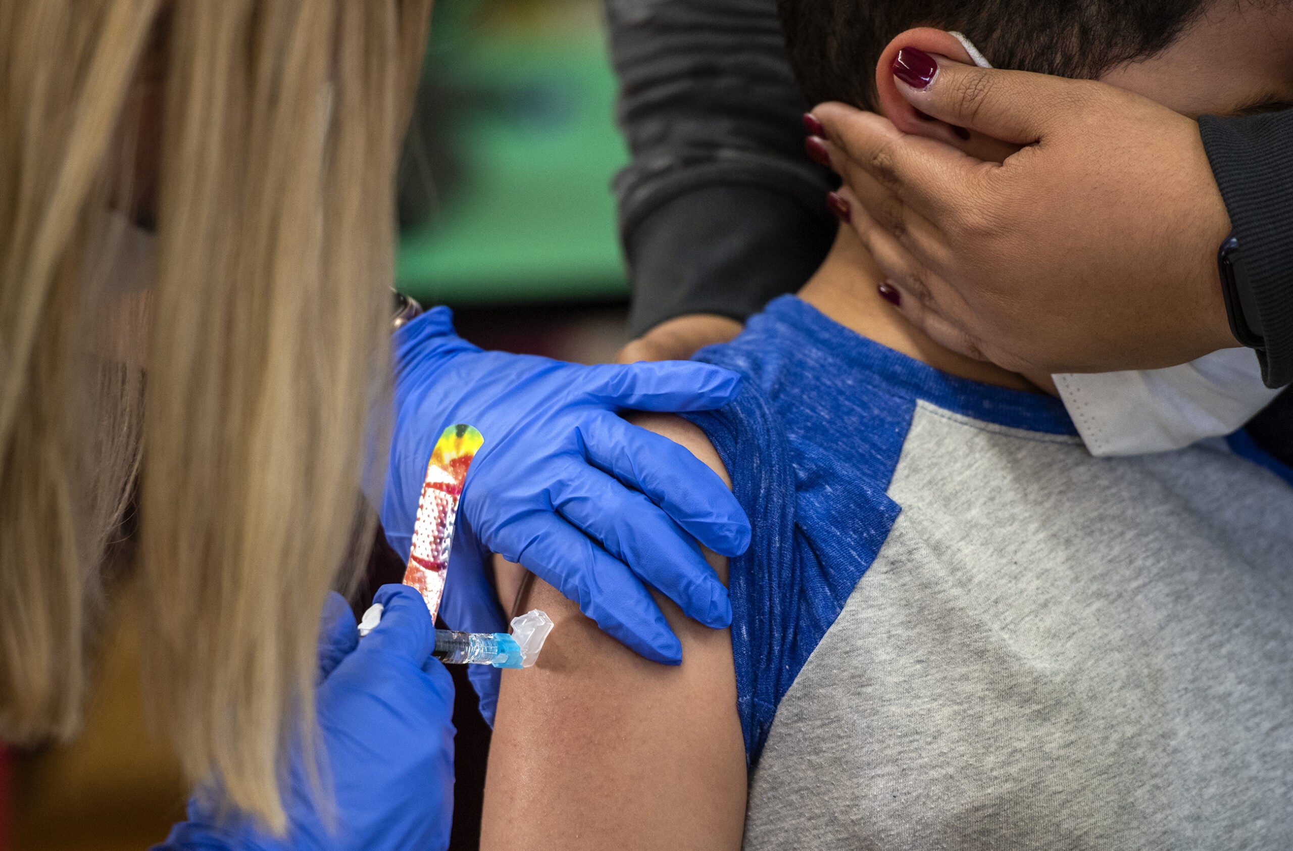 Nine-year-old Jean Aguayo receives both a COVID-19 and influenza vaccine Monday, Nov. 8, 2021, at Townsend Public School in Milwaukee, Wis. Angela Major/WPR