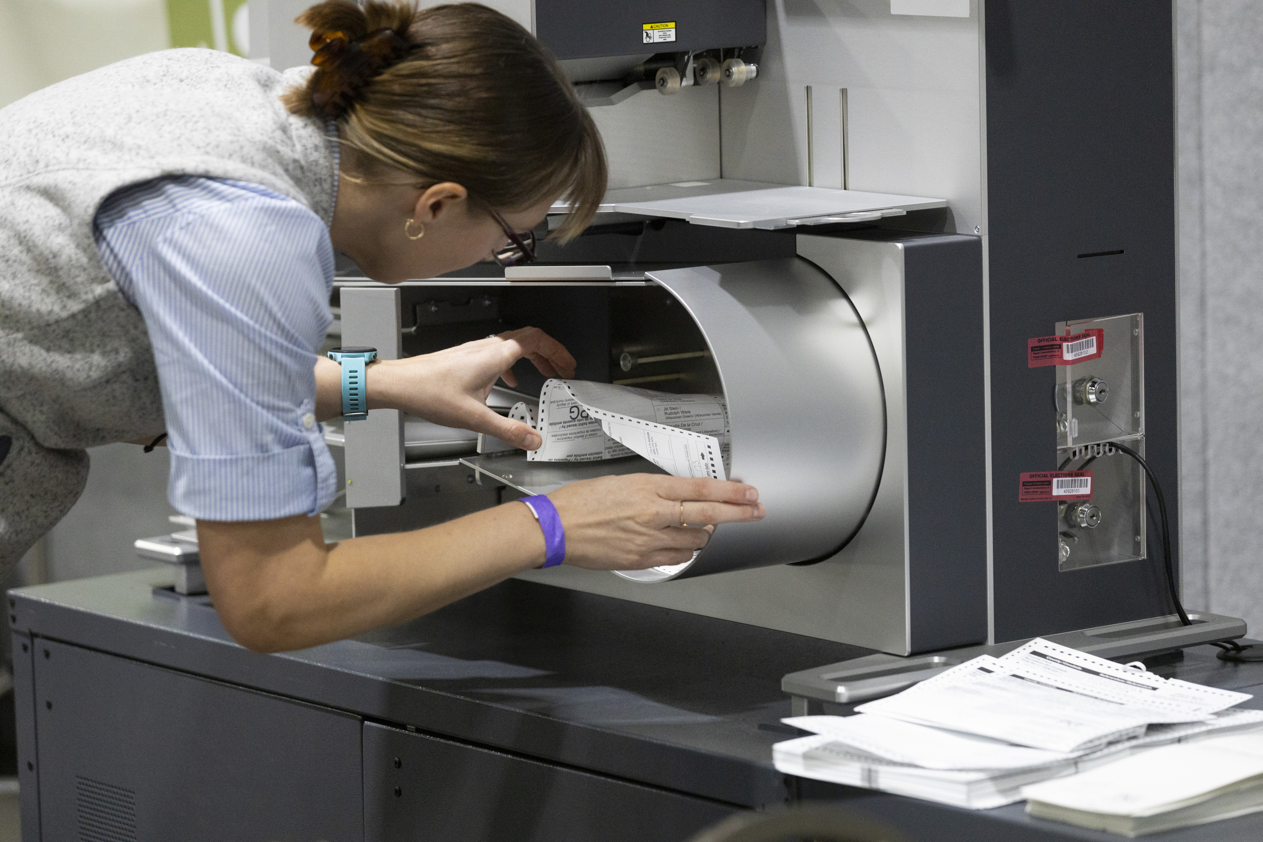 Election workers count votes using a tabulation machine during Election Day on Nov. 5, 2024, at Milwaukee’s central count facility at the Baird Center. (Joe Timmerman / Wisconsin Watch)