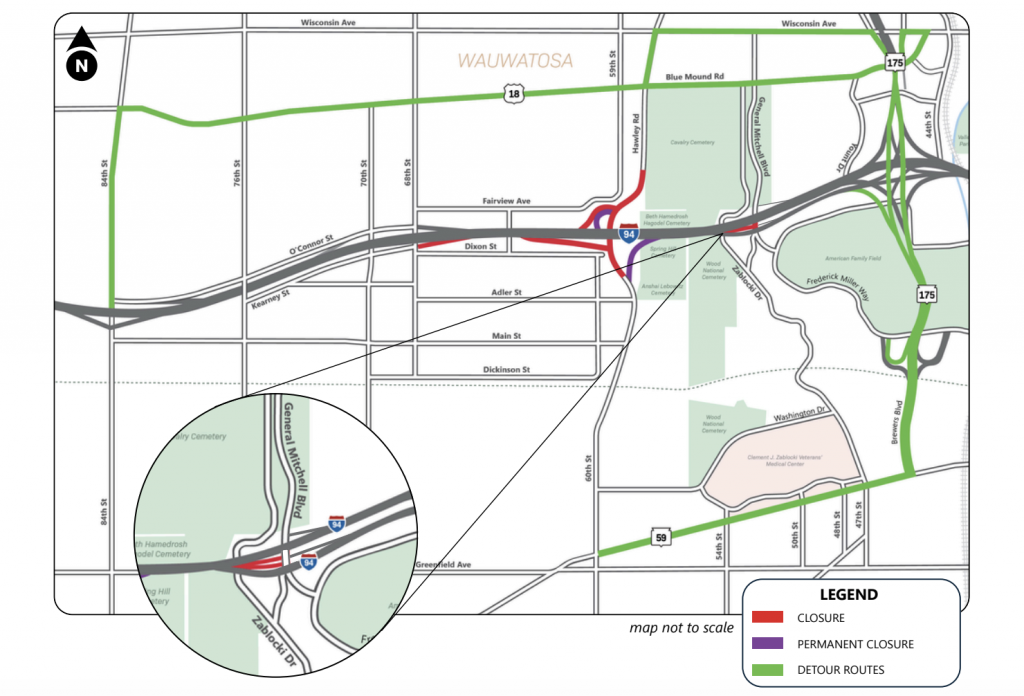 The road will be closed underneath the interstate, cutting off a major north-south artery running along the western edge of American Family Field, the Clement J. Zablocki Veterans Affairs Building and Calvary Cemetery. WisDOT is detouring traffic eastward along W. National Avenue to Wisconsin Highway 175.