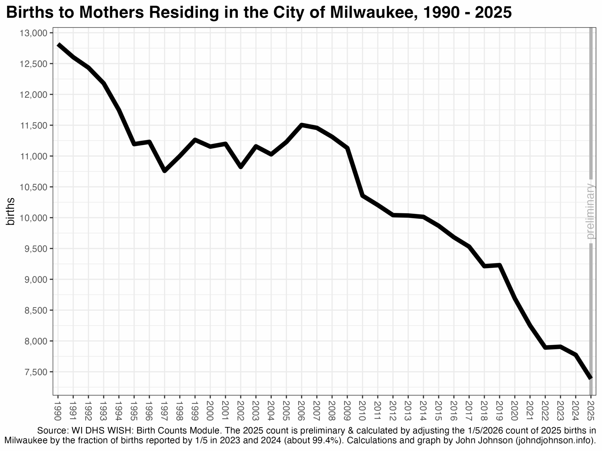 As of Jan. 5, the state’s vital statistics database shows 7,343 Milwaukee births in 2025. Based on the reporting pattern in previous years, I estimate the total number of 2025 births will stand at about 7,386 after the last records trickle in.[i]