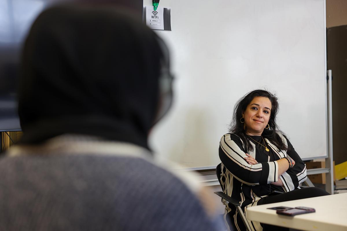 Sheila Badwan, executive director of Hanan Refugee Relief Group, listens to Maryam Durani, cultural program coordinator, Dec. 1, 2025, in Milwaukee. (Jonathan Aguilar / Milwaukee Neighborhood News Service / CatchLight Local)