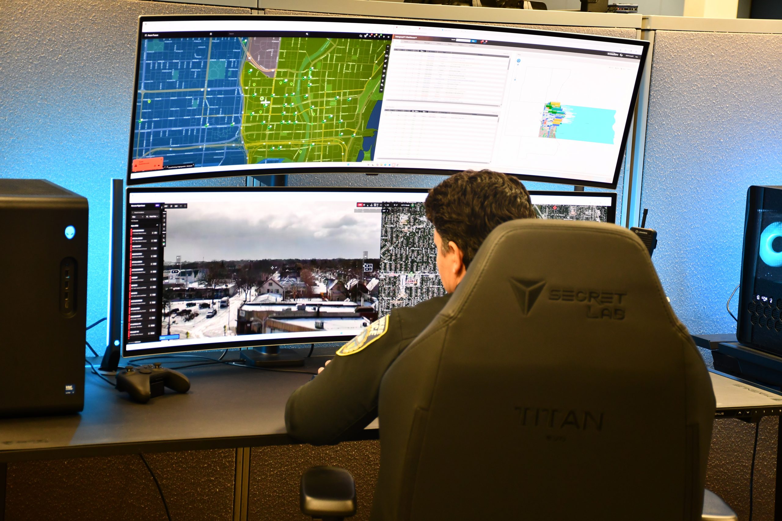 In a nondescript West Side office building, 1150 N. Alois St., with an interior that resembles an unusual cross between a cubicle farm and a teenager’s gaming setup, a five-person squad aims to be the first eyes on the scene without ever needing to stand up.