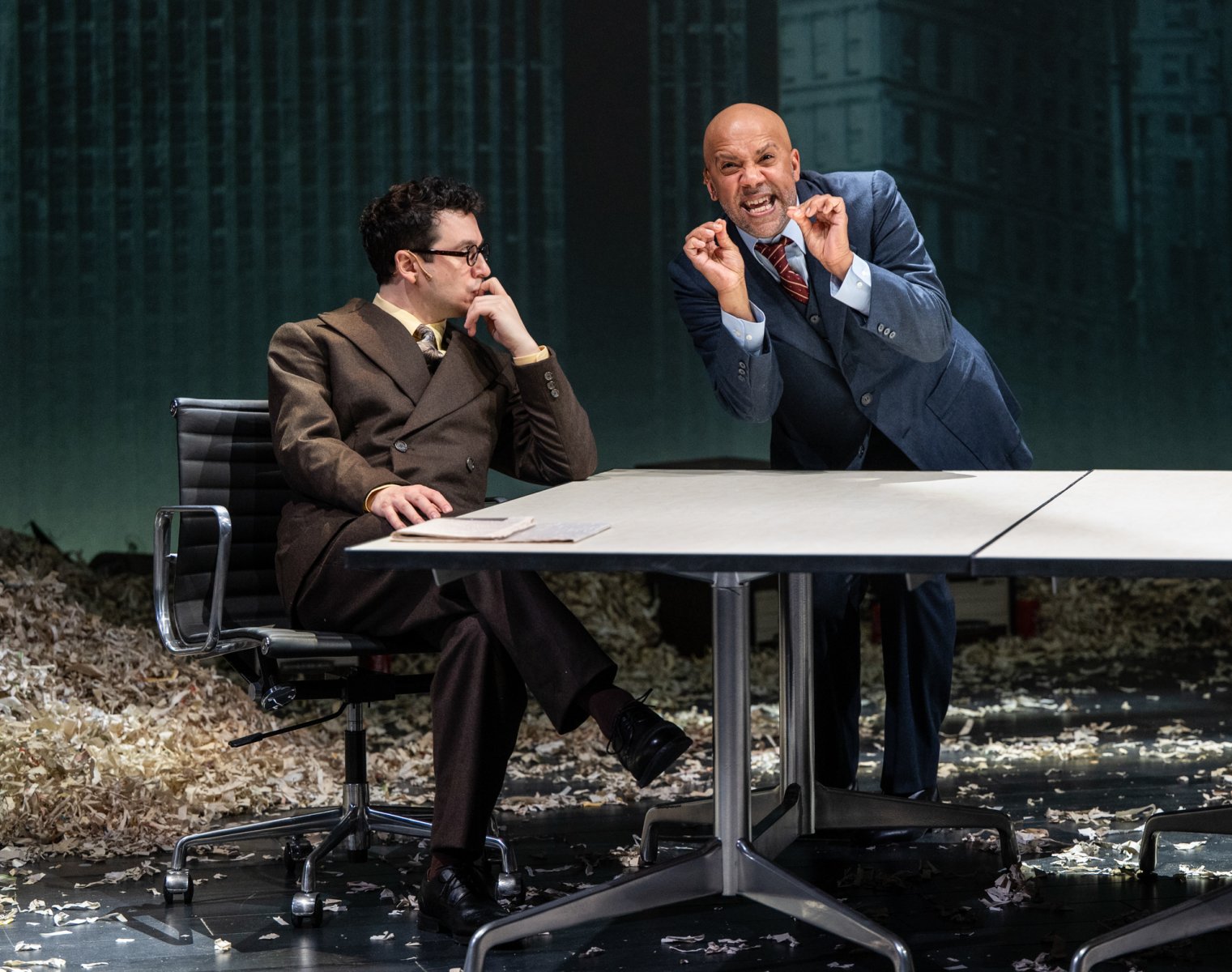 Milwaukee Repertory Theater presents The Lehman Trilogy in the Checota Powerhouse Theater January 13 – February 8, 2026. Pictured L to R: Max Wolkowitz, William Sturdivant. Photo by Michael Brosilow.
