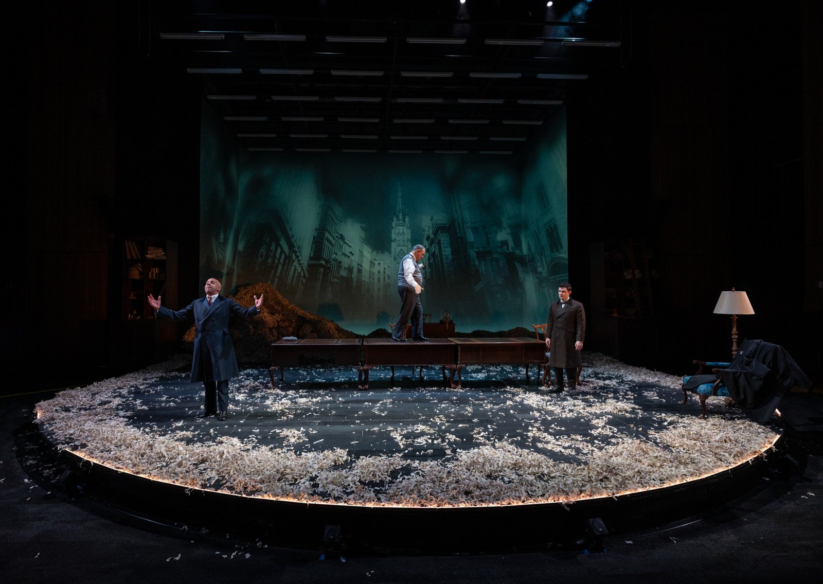 Milwaukee Repertory Theater presents The Lehman Trilogy in the Checota Powerhouse Theater January 13 – February 8, 2026. Pictured L to R: William Sturdivant, Edward Gero, Max Wolkowitz