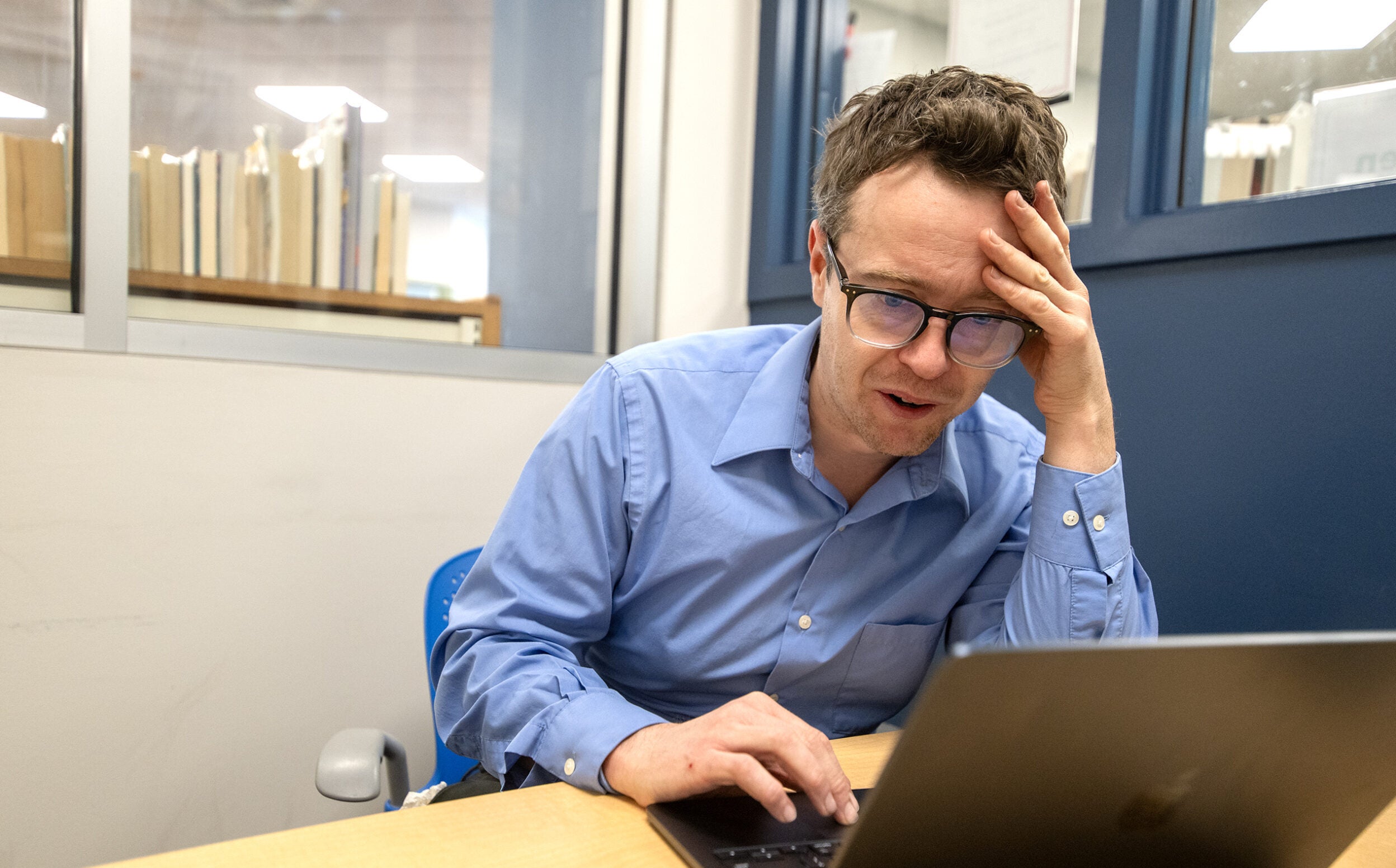 Robin Lee, a former technical project officer in the Weatherization Assistance Program at the U.S. Department of Energy, checks his email as he hunts for jobs Friday, Jan. 9, 2026, in Madison, Wis. Angela Major/WPR