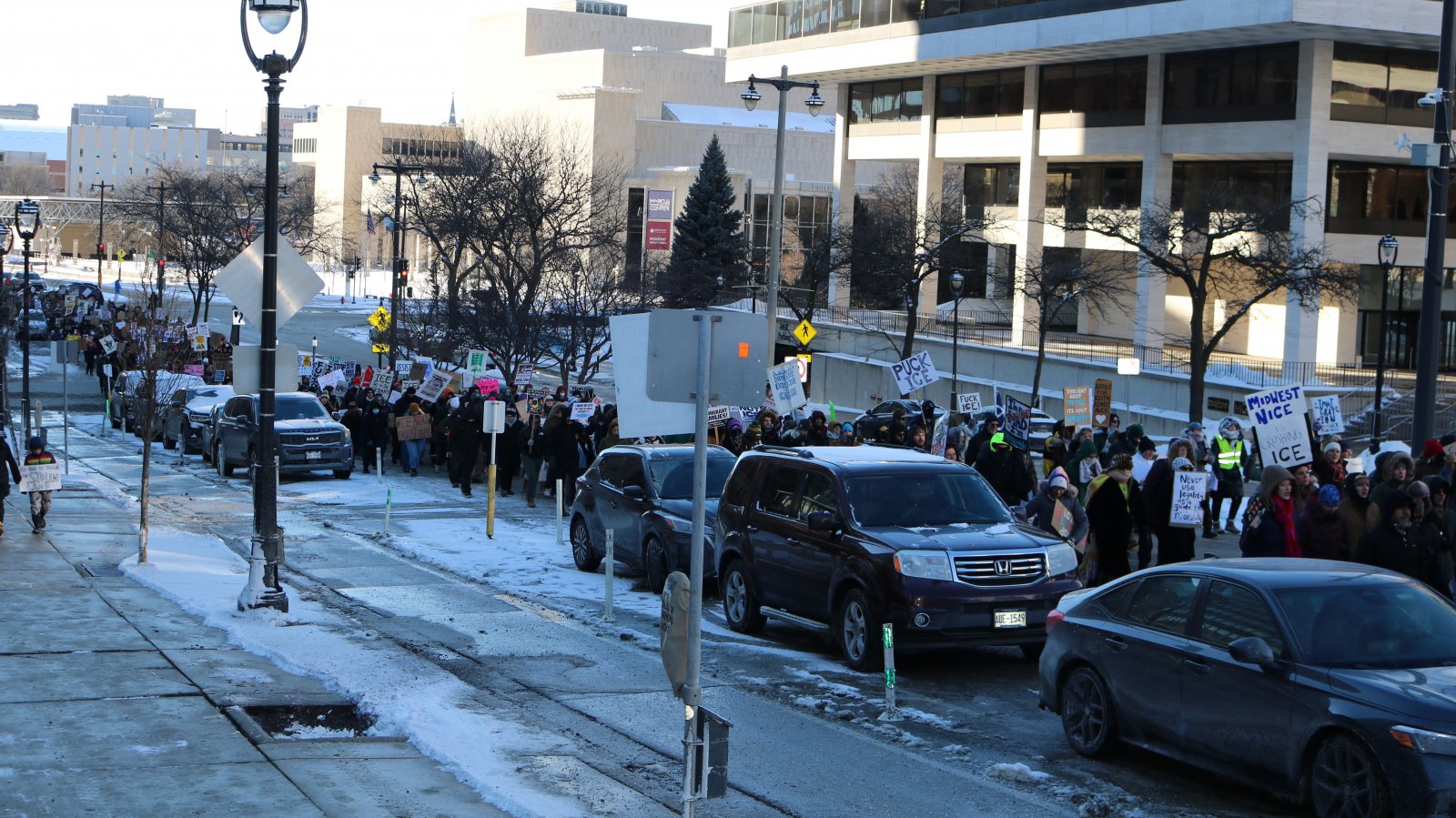 Protestors march through downtown Milwaukee. Photo taken Jan. 30, 2026 by Sophie Bolich.