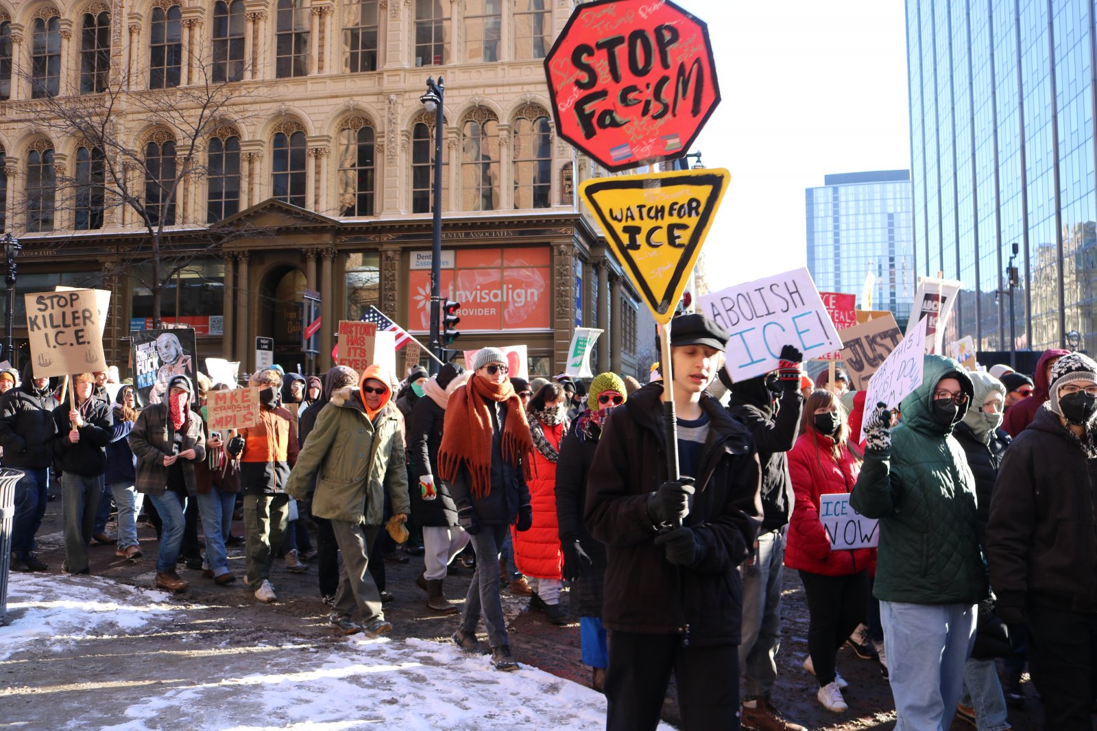 Protestors march through downtown Milwaukee. Photo taken Jan. 30, 2026 by Sophie Bolich.