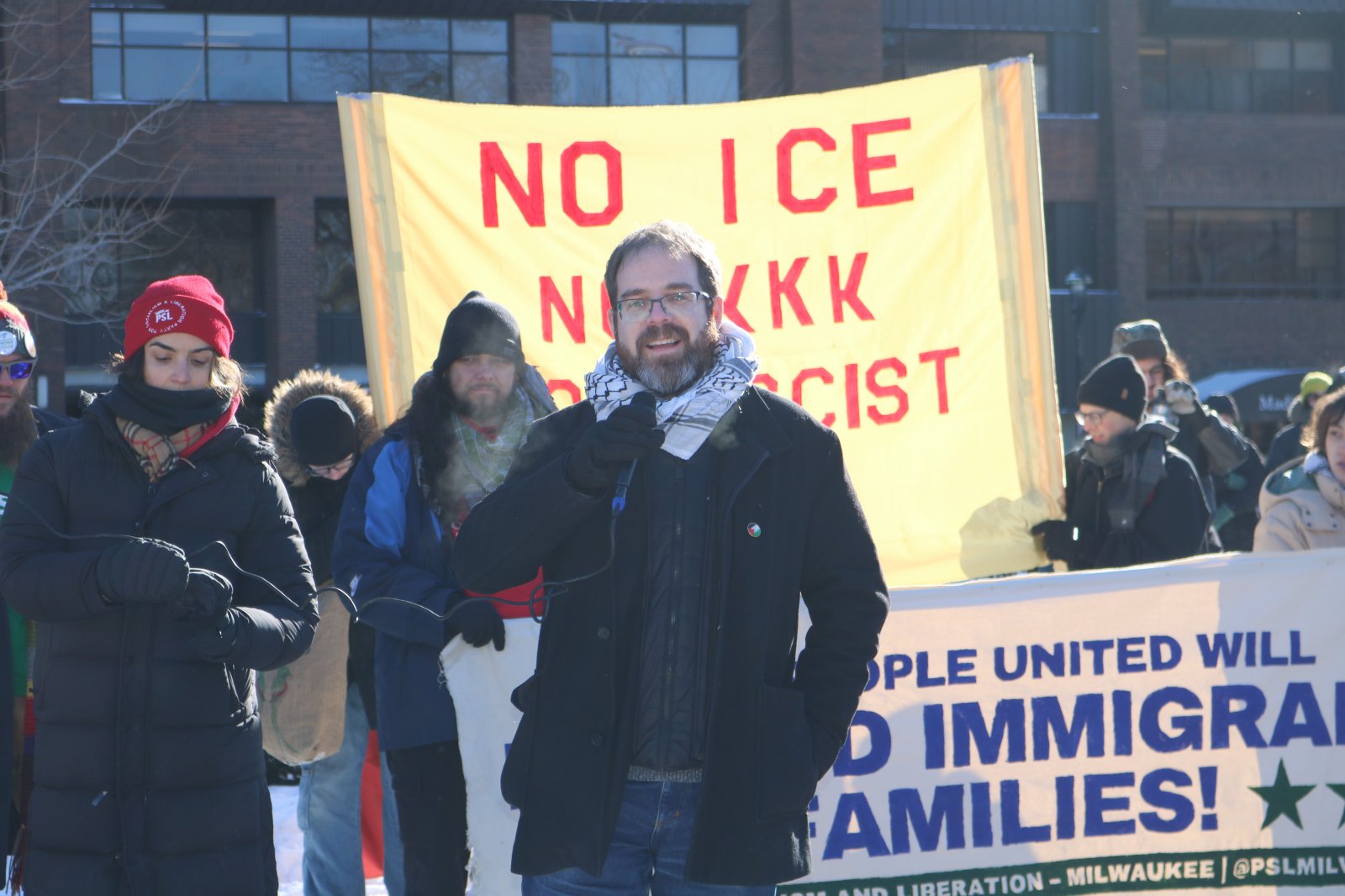 Rep. Ryan Clancy speaks to attendees at a Jan. 30 rally and march at Cathedral Square Park in Milwaukee. Photo by Sophie Bolich.