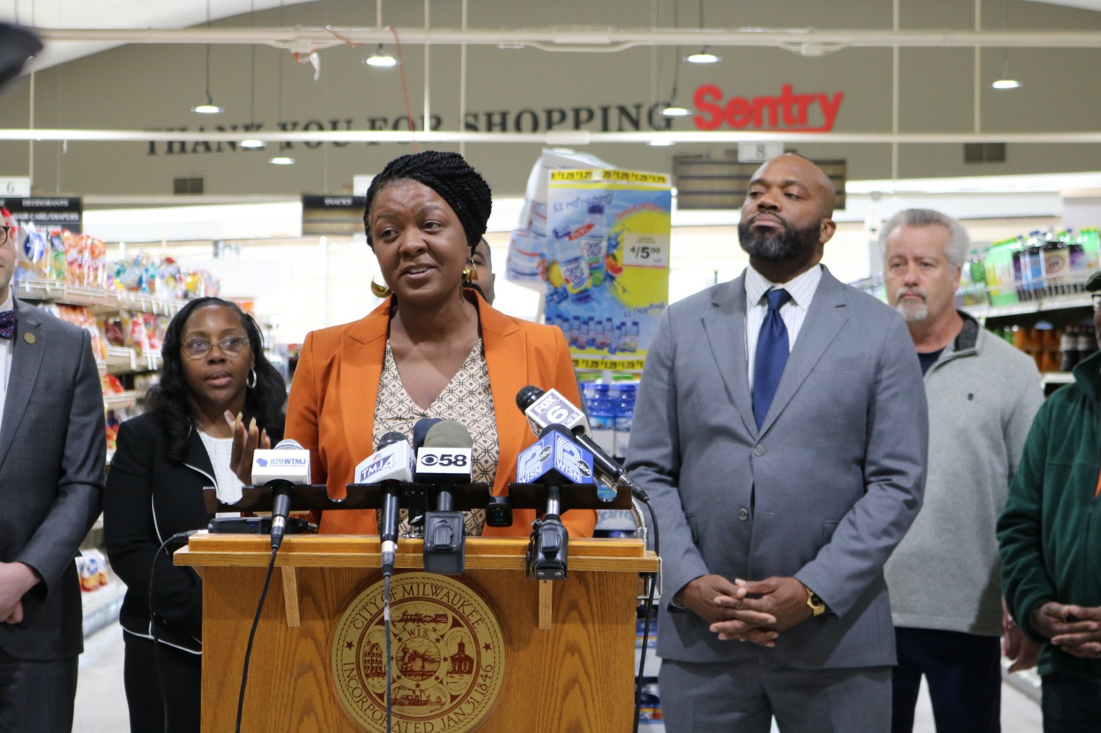 Alderwoman Andrea Pratt speaks during a press conference on food accessibility in Milwaukee. Photo taken Feb. 9, 2026 by Sophie Bolich.