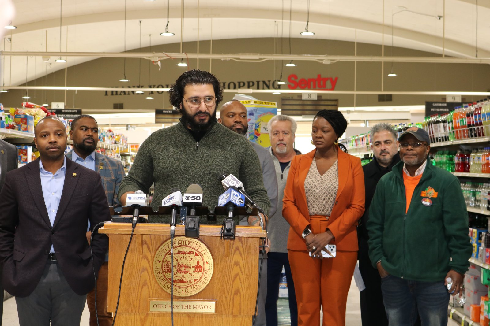Store owner Navjoot Sandhar speaks during a press conference on food accessibility in Milwaukee. Photo taken Feb. 9, 2026 by Sophie Bolich.