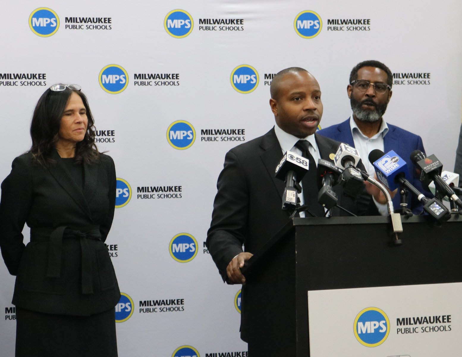 Mayor Cavalier Johnson speaks during a Feb. 24 press conference at Keefe Avenue Elementary School. Photo by Sophie Bolich.