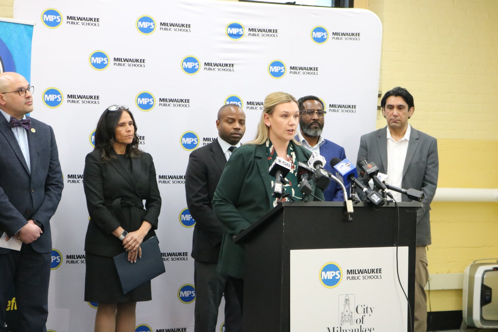 MPS Board President Missy Zombor speaks during a Feb. 24 press conference at Keefe Avenue Elementary School. Photo by Sophie Bolich.