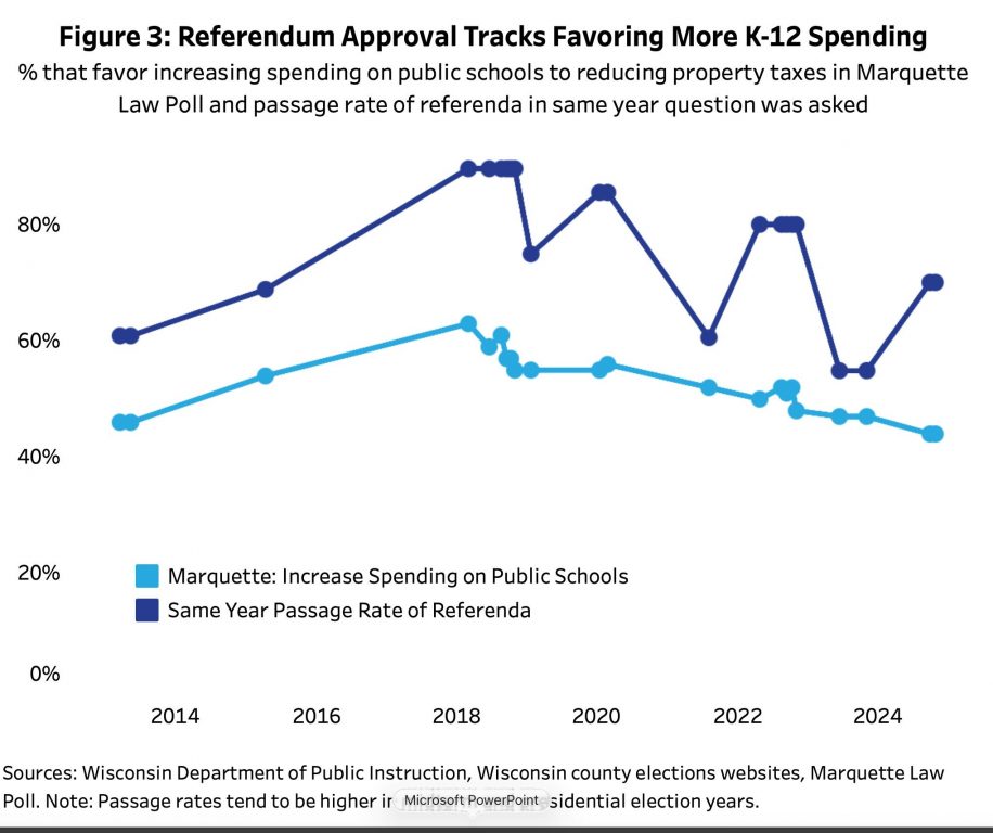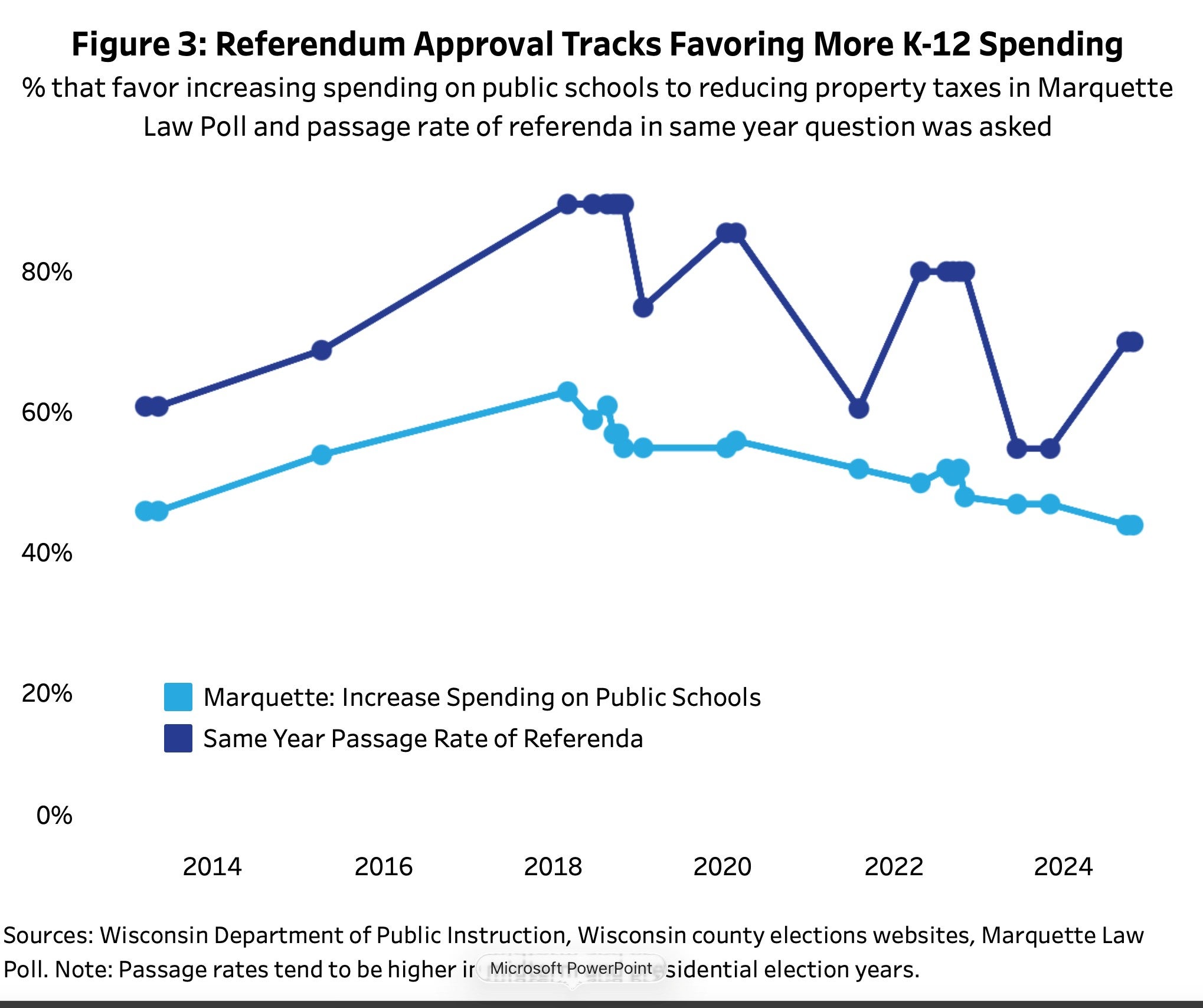 Wisconsin voters are more concerned with reducing their property taxes than increasing funding for public schools. Voters also say they’re less inclined to support a school referendum.