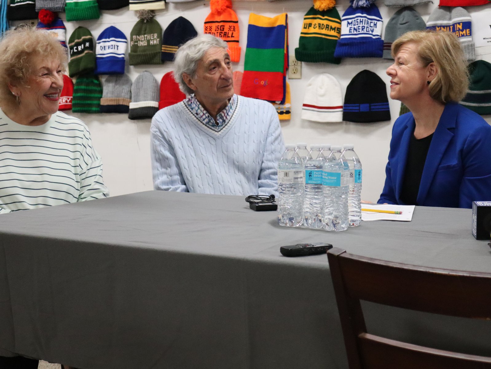 Sen. Tammy Baldwin speaks with Wisconsin Knitwear founders Mauricio and Sheila Arenzon. Photo taken March 6, 2026 by Graham Kilmer.