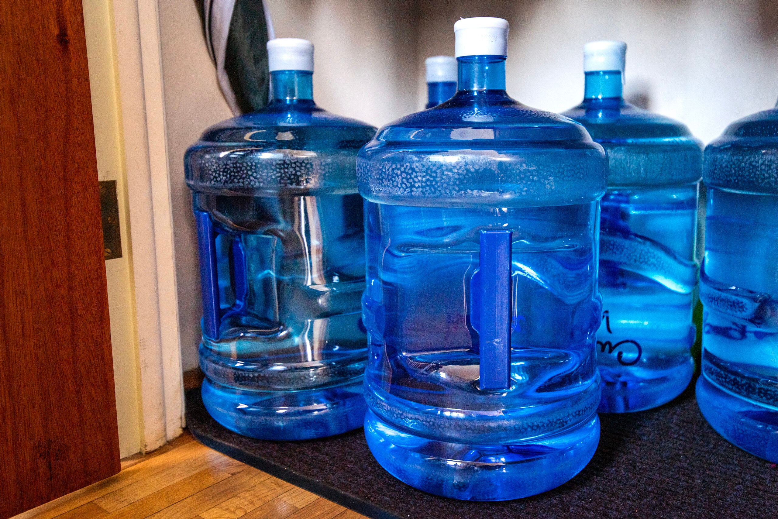 Water stored in a closet near Margie Walker and Jim Boisen’s kitchen in their French Island home Friday, Feb. 21, 2025. Angela Major/WPR