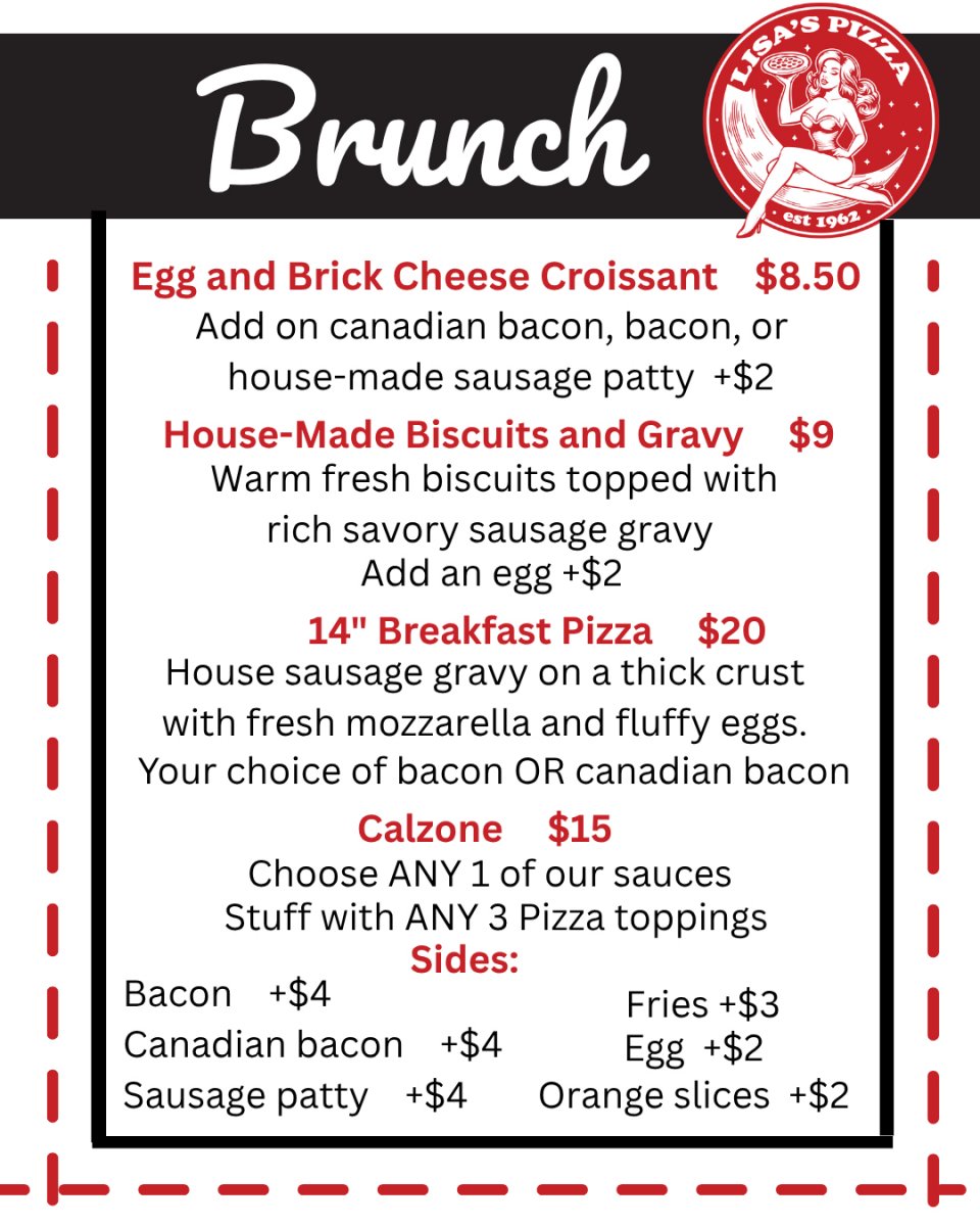 Brunch menu Photo courtesy of Lisa's Pizza.
