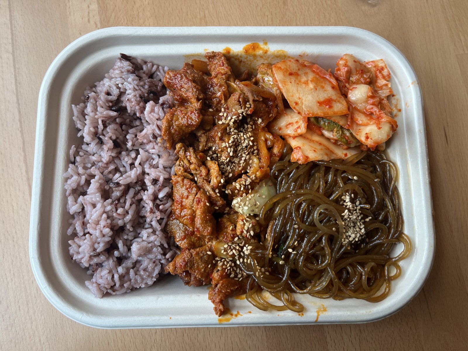 Soban bowl with purple rice, spicy pork, kimchi and japchae. Photo taken April 3, 2026 by Sophie Bolich.