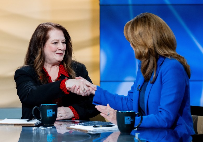 Wisconsin Supreme Court candidates, Court of Appeals Judges Maria Lazar, left, shakes the hand of Chris Taylor, right, at the end of the Wisconsin Supreme Court debate hosted by WISN 12 News, April 2, 2026 at WISN-TV in Milwaukee. (Jovanny Hernandez / Milwaukee Journal Sentinel / POOL)