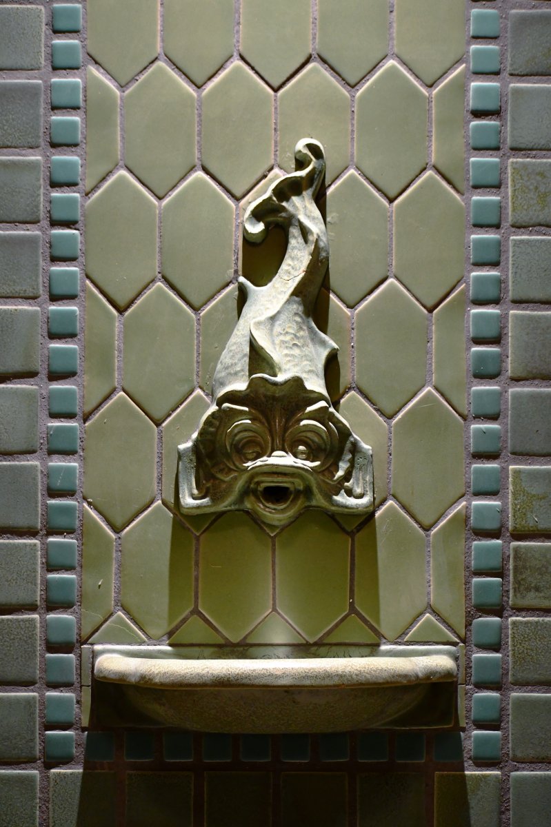 A detail image of the dolphin spout created by the Continental Faience & Tile Co. Photo by Ben Tyjeski.