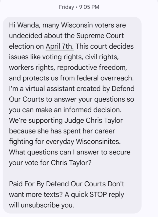 “Got any questions about (Chris Taylor’s) record and why it matters?” a message shared with WPR read. “I’m a virtual assistant standing by to answer your questions any time before you head to the polls on Tuesday. Just reply.”