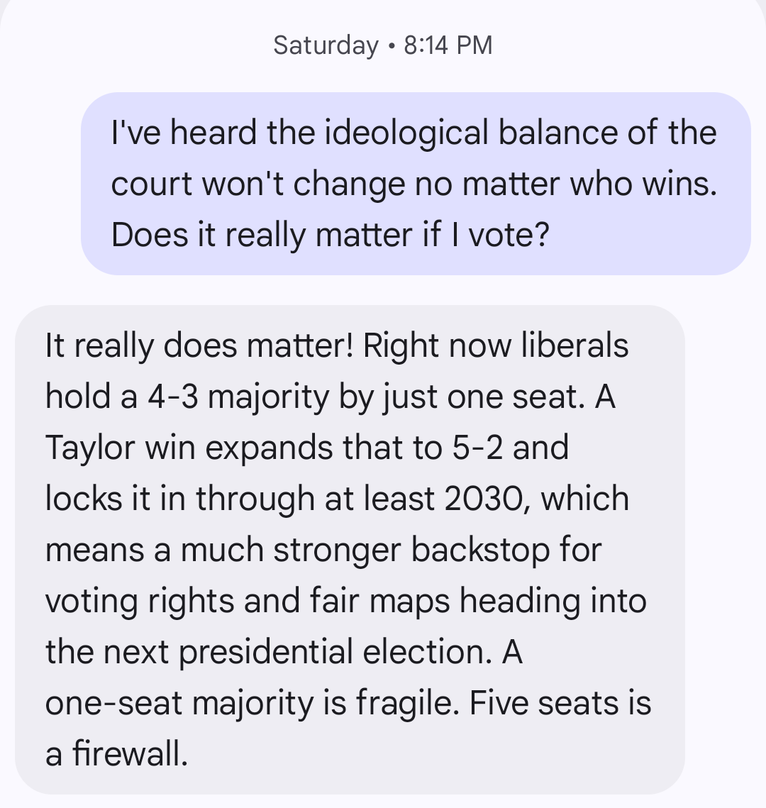In Wisconsin, the group used an AI-powered virtual assistant to target voters identified as “undecided” across the state, sending messages that supported Taylor’s election. More than 1.1 million received texts and over 10,000 responded, Defend Our Courts told WPR.