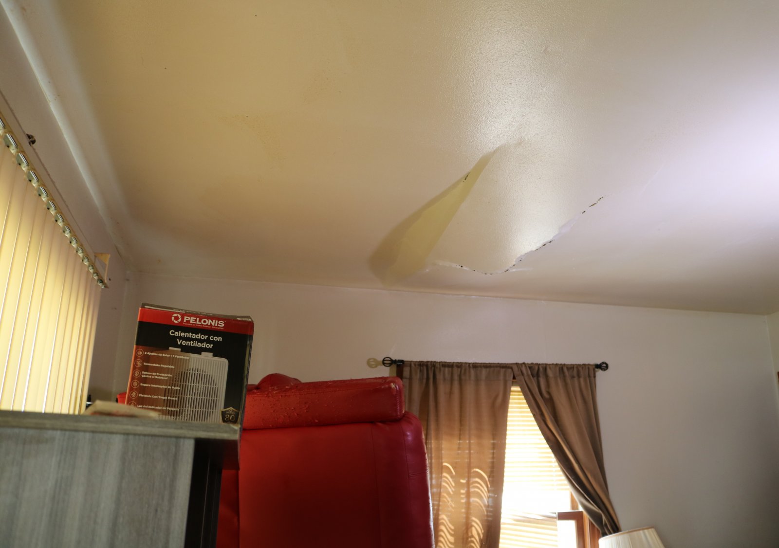Drooping ceiling at the Highgrove Holdings-owned house where Ishon Arnold lives with his family. Photo taken April 16, 2026 by Sophie Bolich.