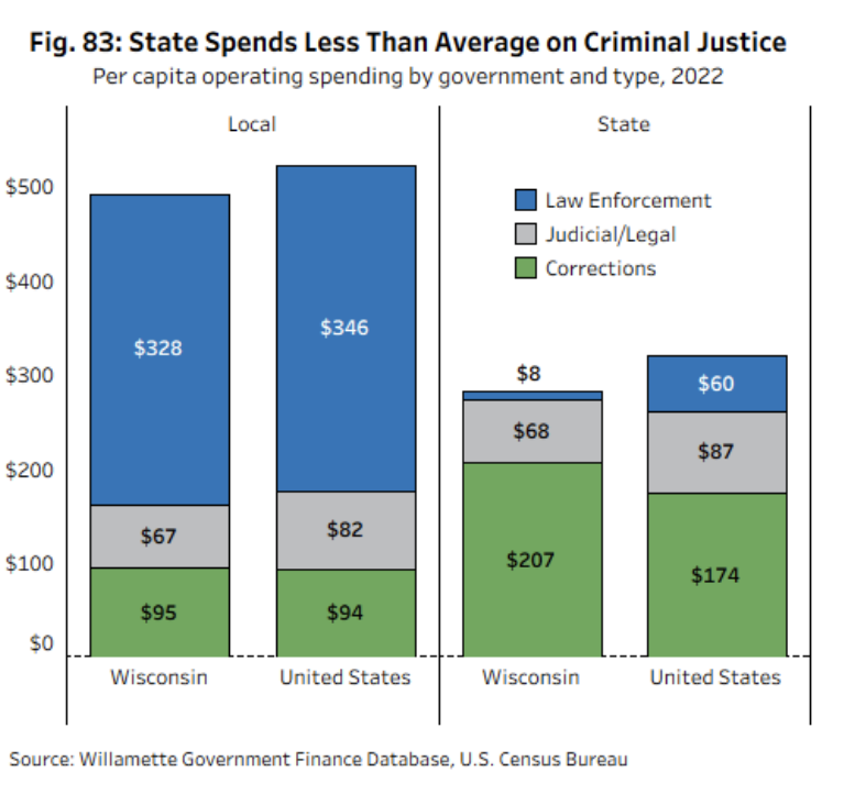 In 2022, Wisconsin spent less than the national average on state and local law enforcement, ranking 32nd in the country, the report finds. Judicial and legal spending was also below average, at 35th.