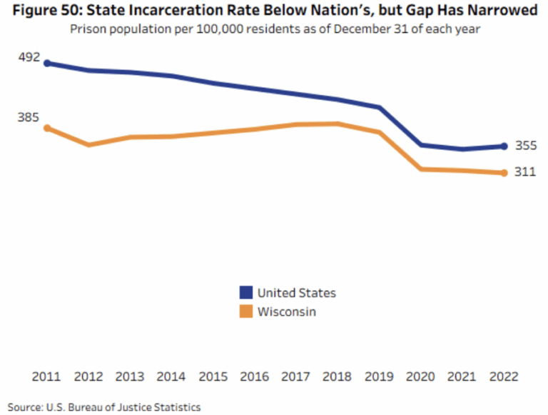 Wisconsin ranked 23rd among other states. Indiana and Michigan had higher incarceration rates, while Iowa, Illinois and Minnesota had “considerably lower” rates.