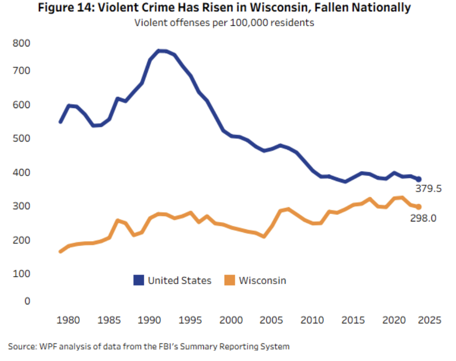 The rate of violent crime has risen in Wisconsin over time despite a decline nationwide, the report finds. Wisconsin’s rate of violent crime remains lower than the national rate. The state has followed a national trend of steadily declining property crime.