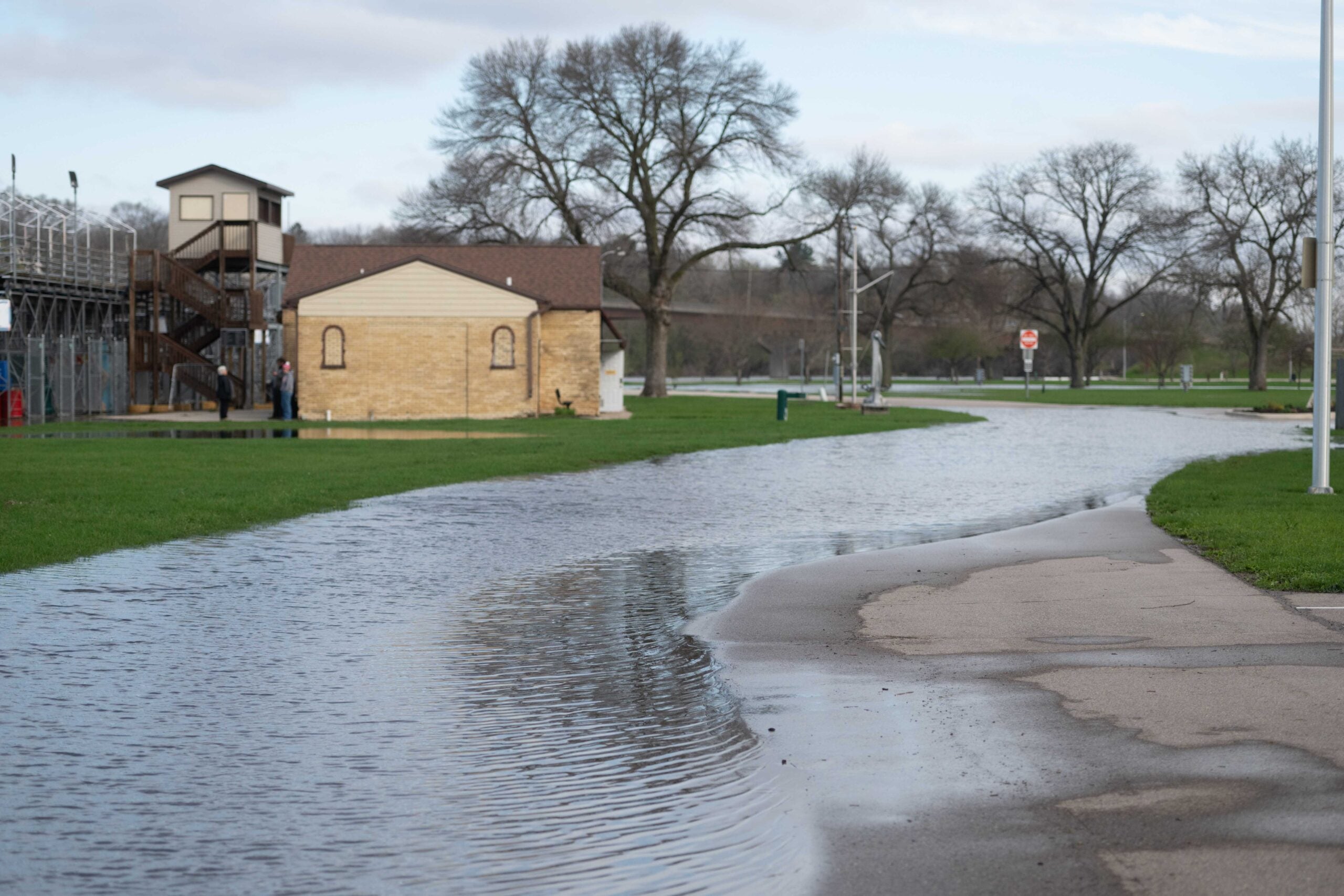 Roads and pathways are flooded at Traxler Park near the Rock River on Saturday, April 18, 2026, in Janesville, Wis. Angela Major/WPR