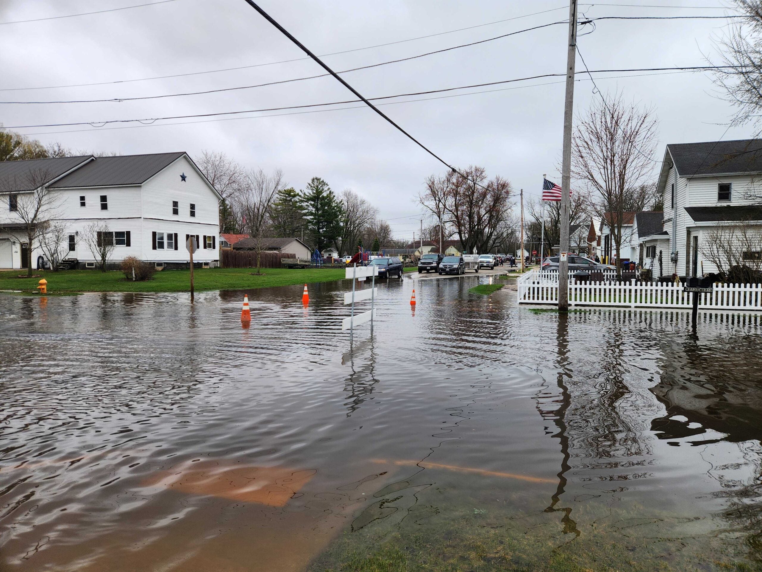 A flooded residential street is seen with water covering the road and lawns, traffic cones blocking access, and overcast sky in Shiocton, Wis., on April 15, 2026. Joe Schulz/WPR