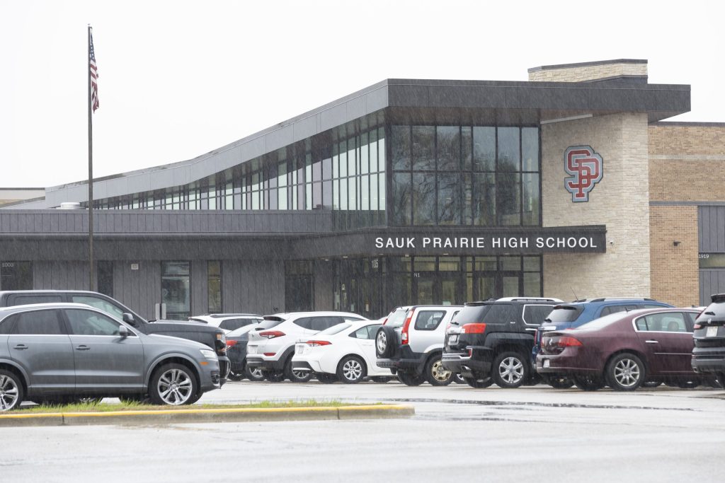 Rain falls outside Sauk Prairie High School on April 27, 2026, in Prairie du Sac, Wis. The Sauk Prairie School District is one of 26 Wisconsin school districts where voters denied referendums in the recent spring election. District leaders are now seeking other funding sources and making cuts to areas that would have been funded by the referendum. (Joe Timmerman / Wisconsin Watch)