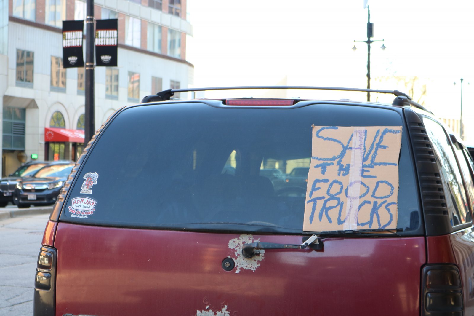 Car sign at an April 30 demonstration led by food truck operators. Photo by Sophie Bolich.