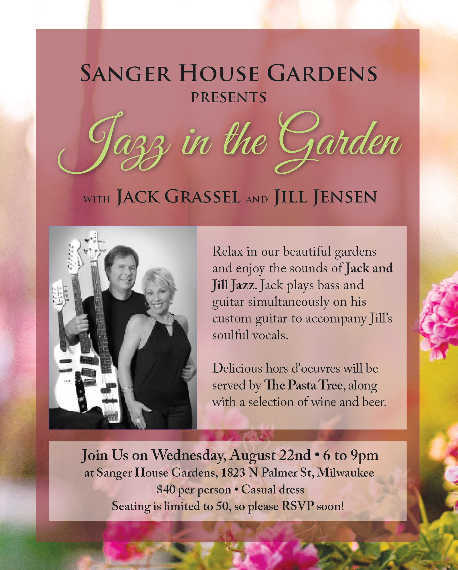 Sanger House Gardens is having a Jazz in the Garden party, have a little food, live Jazz music and enjoy a little intimate mid-week break. August 22nd. from 5:45 p.m. to 9 p.m. Tickets cost: $40. If you would like to attend email Sangerhousegardens@att.net, or call 414-640-6003.