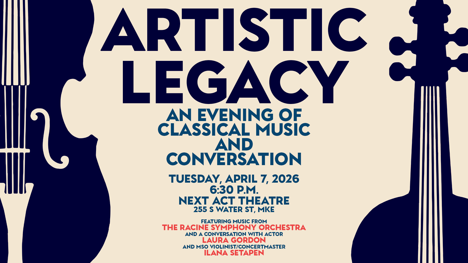 Join Next Act Theatre for “Artistic Legacy: An Evening of Classical Music and Conversation” in honor of our final show of the 2025-26 season, DINNER WITH THE DUCHESS. Patrons can grab a drink at the bar before heading into the theatre to experience the talent of violinists from the Racine Symphony Orchestra. Then, settle in for a discussion on art, legacy and what it means to be a woman in the spotlight featuring Lunt-Fontanne Fellow and Milwaukee theatre legend (and star of DINNER WITH THE DUCHESS), Laura Gordon and First Associate Concertmaster and First Violin with the Milwaukee Symphony Orchestra, Ilana Setapen.