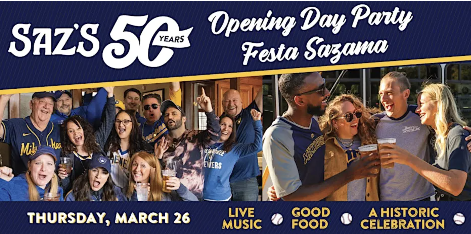 There is nothing like Opening Day in Milwaukee, and there is no place to experience it like Saz’s State House. As we enter 2026, celebrating 50 Years of “The Finest”, we’re inviting you to be a part of a historic weekend. Kick off the baseball season with a celebration like none other. We’re raising the tent on the parking lot and cranking up the energy to start our 50th year with a bang. This is more than just a game; it’s the start of Festa Sazama, a tribute to five decades of great food, quality service, and “The Finest times. Event activities start at 9am and will run till 9pm!