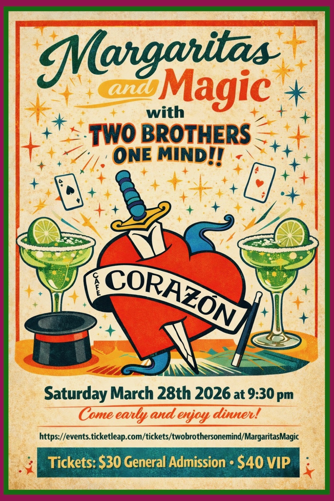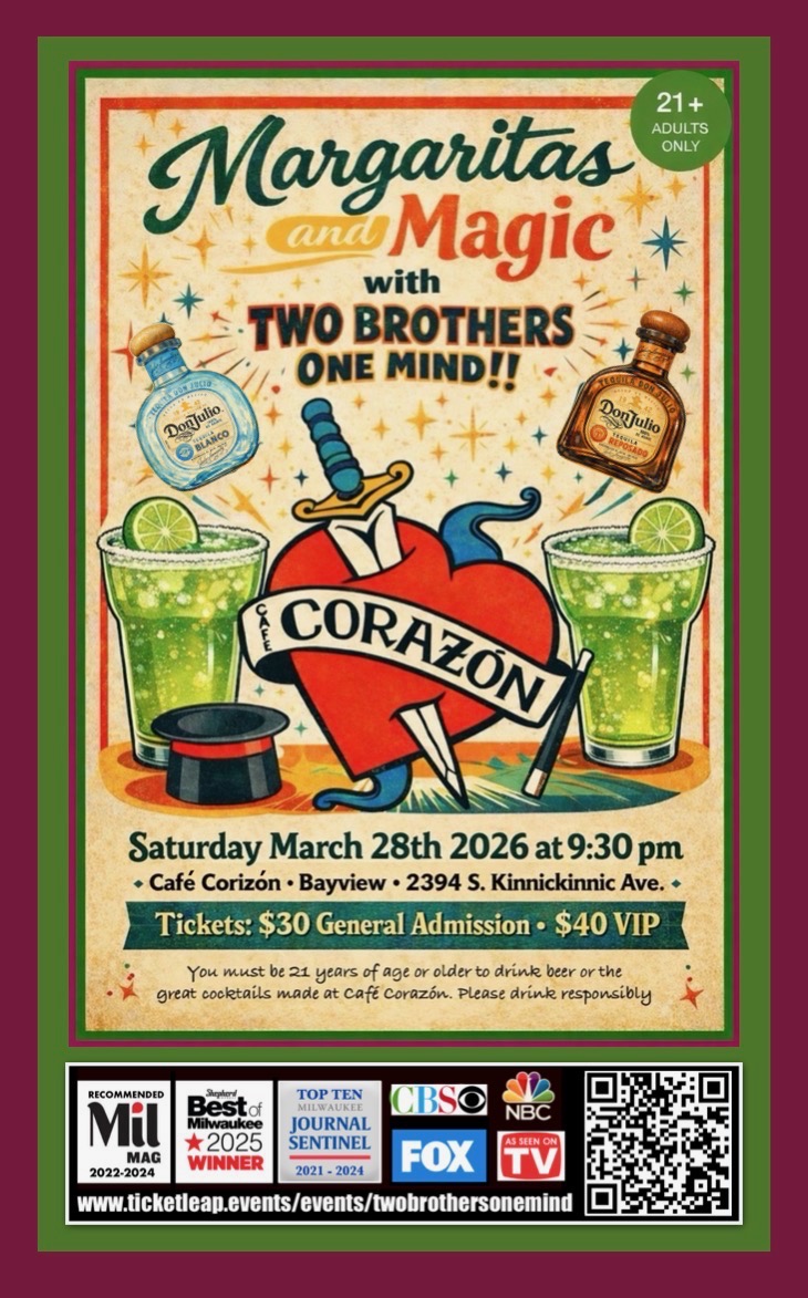Looking for a fun date night or something unique to do in Milwaukee? Come celebrate and get ready for an unforgettable evening of Margaritas & Magic at Café Corazón hosted by “The Best Magicians in Milwaukee” Two Brothers One Mind.