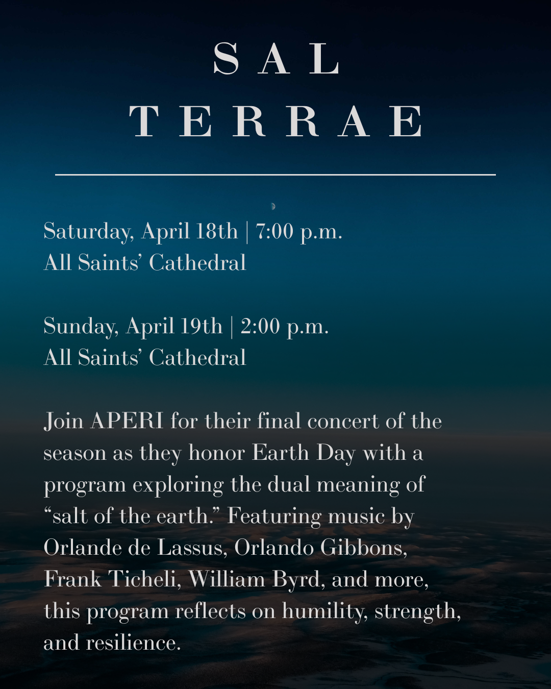 Join Aperi Animam for the final concert of their season as they honor Earth Day. Featuring music by Orlande de Lassus, Orlando Gibbons, Frank Ticheli, William Byrd, and more, this program reflects on humility, strength, and resilience as well as explores the dual meaning of “salt of the earth.” Free parking is available at the Lincoln Center for the Arts.