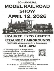 METRO Model Railroad Club’s annual show returns for its 30th straight year bigger and better than ever. The show will have nine operating model railroads and 120 tables of dealers and swappers. Model railroading has many different scales (sizes) in which modelers build and six of them will be shown at this show. All were created by railroad clubs in Southeast Wisconsin. All of the clubs showing are welcoming new members, especially encouraging young “Newbies” to learn the arts and skills that they want to share. A new layout this year is by the Milwaukee Chapter of the European Train Enthusiasts that will feature European Trains of 3 different scales METRO knows that kids love these shows and have plans to make this one even more exciting for them. Some of the layouts will let children operate the trains. A scavenger hunt with prizes for kids is also planned. Railroad caps and whistles for kids will be available to purchase. The dealers’ tables will exhibit the wide variety of equipment and scenery that can be used to create these displays. Some dealers are willing to buy or swap equipment. A few dealers will have railroad memorabilia from the glory days of railroading that people can purchase. Typically, the costs of items at the show is well below what these items can be purchased for from hobby stores or off the internet, and hobbyists can often find items long out of stock or rarely available. The show, at the Expo Center on the Ozaukee County Fairgrounds in Cedarburg, runs from 9 a.m. to 4 p.m. Parking is free. Admission is by a $5 donation; children under 12 are admitted free with an adult.