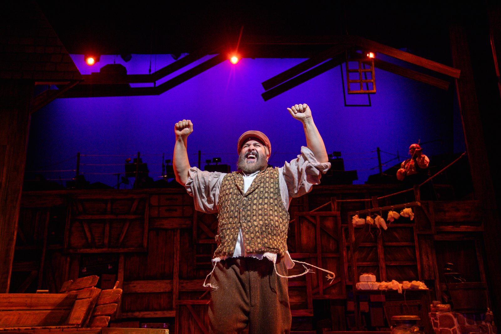 (I. to r.) Andrew Varela (Tevye) and Kimberly Hanson (The Fiddler) in Skylight Music Theatre’s production of Fiddler on the Roof running October 3-26, 2025. Photo by Mark Frohna.
